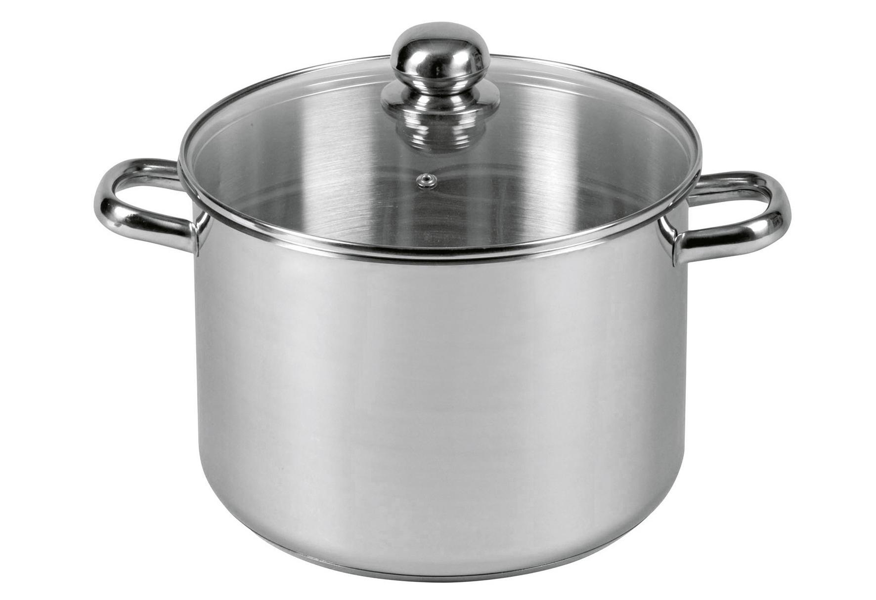 Edelstahl rostfrei / Aluminium, Kapselboden, Wandstärke 0,6 mm, Bodenstärke 3 mm, gebördelter Rand, Glasdeckel mit Rundknopf, Hohlgriffe, in Folie eingeschweißt, für alle Herdarten geeignet, spülmaschinenbeständigLieferumfang: