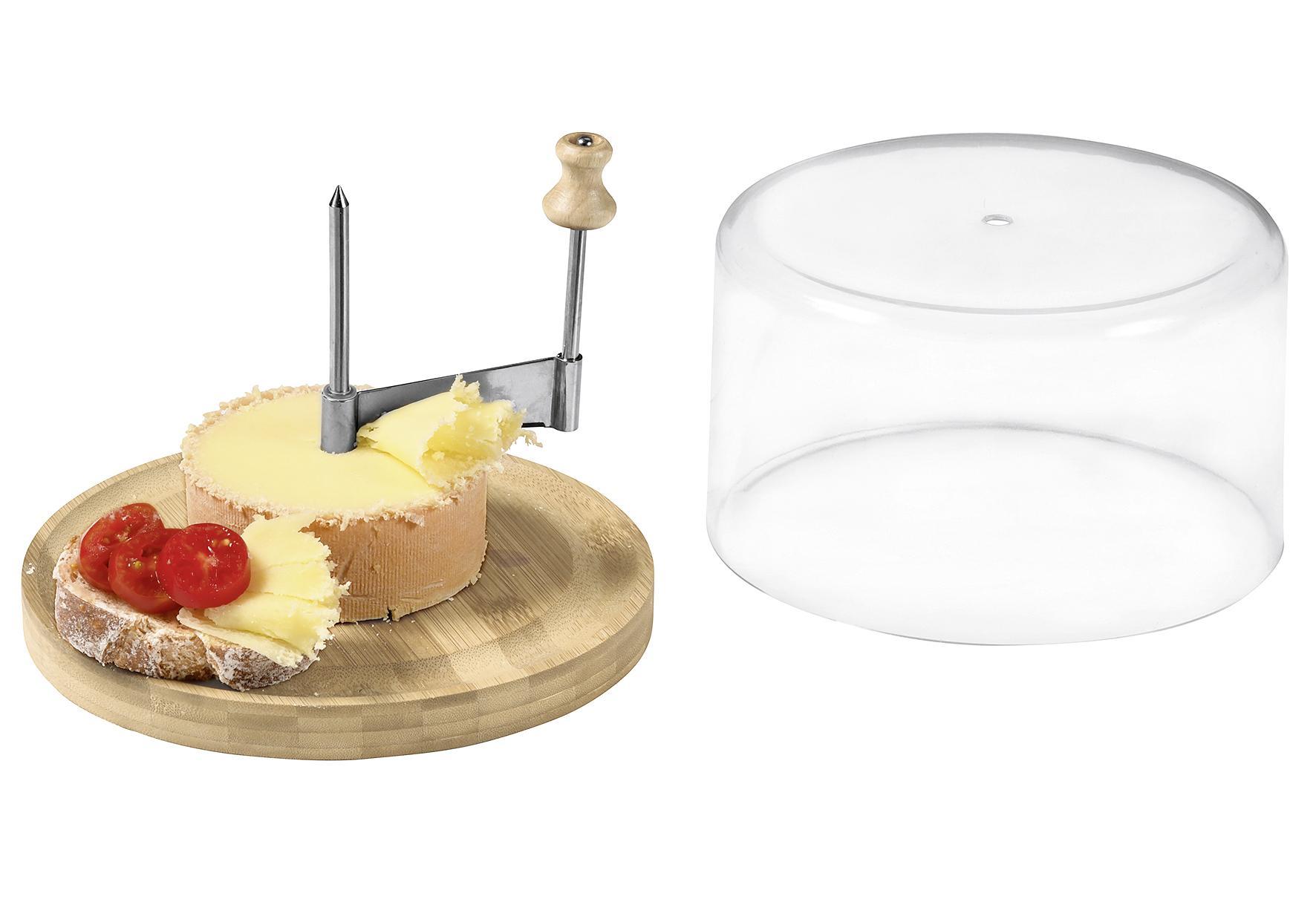 Käsehobel mit Haube, Platte aus Bambus, FSC-zertifiziert, Maße: Ø 21,7 cm / Stärke: 2 cm, Höhe der Haube: 12 cm, Gesamthöhe: 13,7 cm, Frischhaltehaube aus hochwertigem Kunststoff, Messer aus rostfreiem Edelstahl