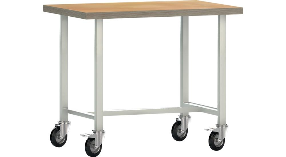 geschweißtes Gestell aus Vierkantrohr 40 x 40 mm · Lackierung lichtgrau, RAL 7035 · Buche-Multiplexplatte, Stärke 40 mm · fahrbar · 4 Lenkrollen aus Vollgummi Ø 125 mm, davon 2 mit Feststeller · Tragfähigkeit max. 300 kg bei gleichmäßig verteilter statischer FlächenlastAttribute