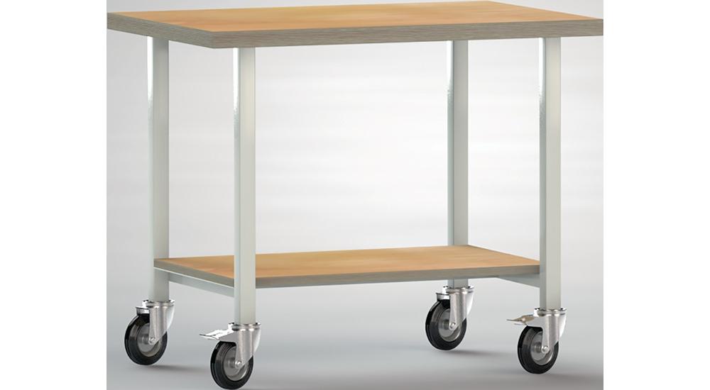 geschweißtes Gestell aus Vierkantrohr 40 x 40 mm · Lackierung lichtgrau, RAL 7035 · Buche-Multiplexplatte, Stärke 40 mm · fahrbar · 4 Lenkrollen aus Vollgummi Ø 125 mm, davon 2 mit Feststeller · Tragfähigkeit max. 300 kg bei gleichmäßig verteilter statischer Flächenlast · unten mit Ablageboden aus 20 mm starker Buche-Multiplexplatte über die komplette FlächeWeitere technische Eigenschaften:
