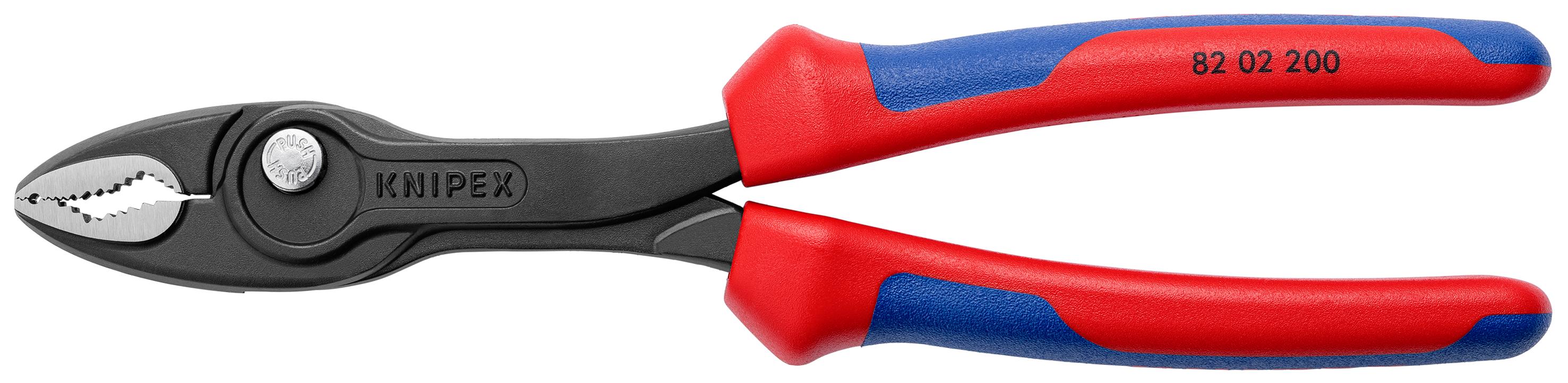 82 02 200 KNIPEX TwinGrip® Einzigartige Kombination: Frontgreif- und Seitengreif-Funktion, durchgestecktes Gelenk, Druckknopfverstellung. Sehr schlanke Zange: Arbeiten auch in beengten Bauräumen, mit schlanker Drehzone für schnelles Schrauben. Bissiges Frontgreifmaul mit robusten Zähnen und hoher Übersetzung an der Maulspitze. Große Front- und Seitengreif-Kapazitäten: für Durchmesser und Schlüsselweiten 4 – 22 mm. Zuverlässiges, frontales Greifen flacher Werkstücke durch Dreipunkt-Anlage. Greifen, Anziehen und Lösen von Schrauben mit verschlissenen Köpfen und Antrieben. Fünffach verstellbares Gleitgelenk mit Druckknopfverstellung für präzises Anpassen der Greifweite. Klemmschutz mindert das Risiko gequetschter Finger. Langlebig und belastbar durch robustes, durchgestecktes Zangengelenk. - Einstellpositionen: 5 - Kapazität für Rohre (Durchmesser): Ø 5/32 – 7/8in - Kapazität für Rohre (Durchmesser): Ø 4 – 22mm - Kapazität für Muttern, Schlüsselweite (mm): 4 – 22mm - Kapazität für Muttern, Schlüsselweite (Zoll): 5/32 – 7/8in- Einzigartige Kombination: Frontgreif- und Seitengreif-Funktion, durchgestecktes Gelenk, Druckknopfverstellung