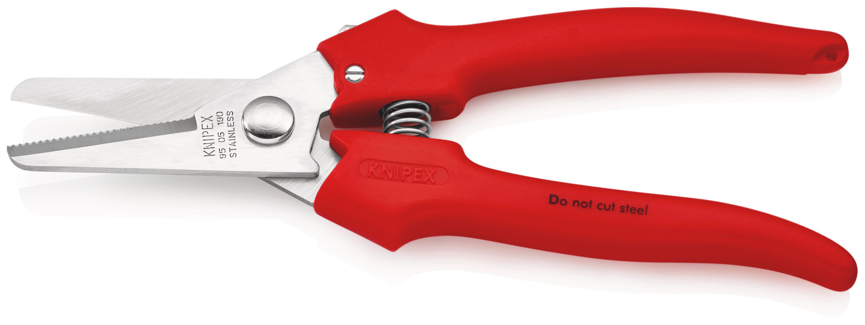 95 05 190 Kombischere Zum Schneiden von Pappe, Kunststoff, Al-, Ms- und Cu-Folien. Nicht für Stahldraht und Eisenblech geeignet. Gehärtete Schneiden mit Präzisionsschliff. Mit Öffnungsfeder und Sperrklinke. Klemmschutz verhindert Quetschverletzungen. Nachstellbares Schraubgelenk.- zum Schneiden von Pappe, Kunststoff, Al-, Ms- und Cu-Folien