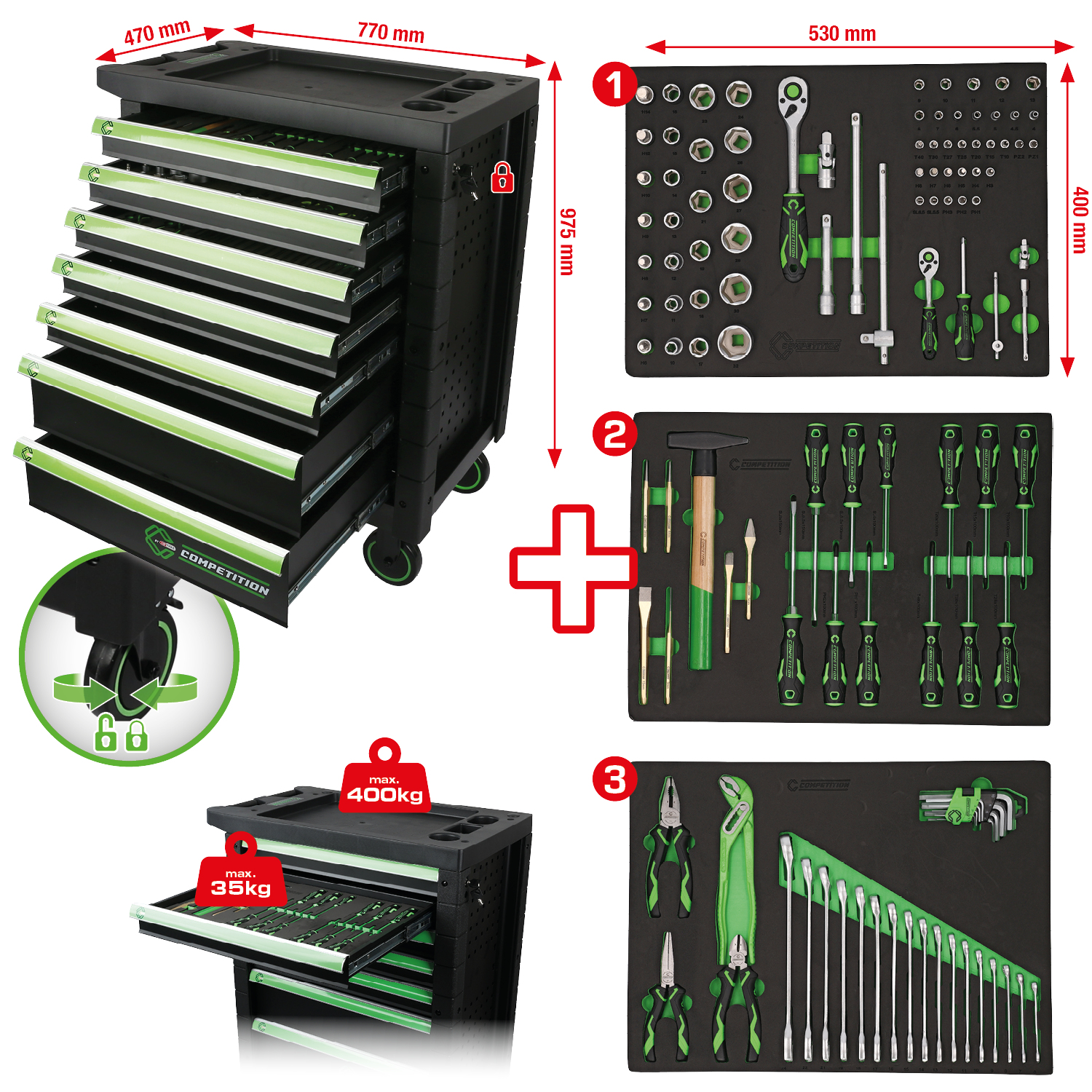 KS TOOLS COMPETITION Werkstattwagen mit 7 Schubladen und 119 Premium-Werkzeugen
