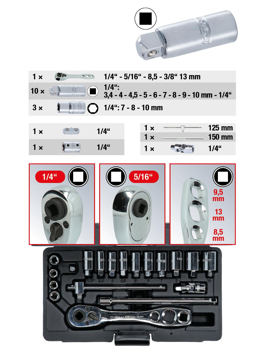 - Größen 1/4“ + 5/16“ am Ratschenkopf