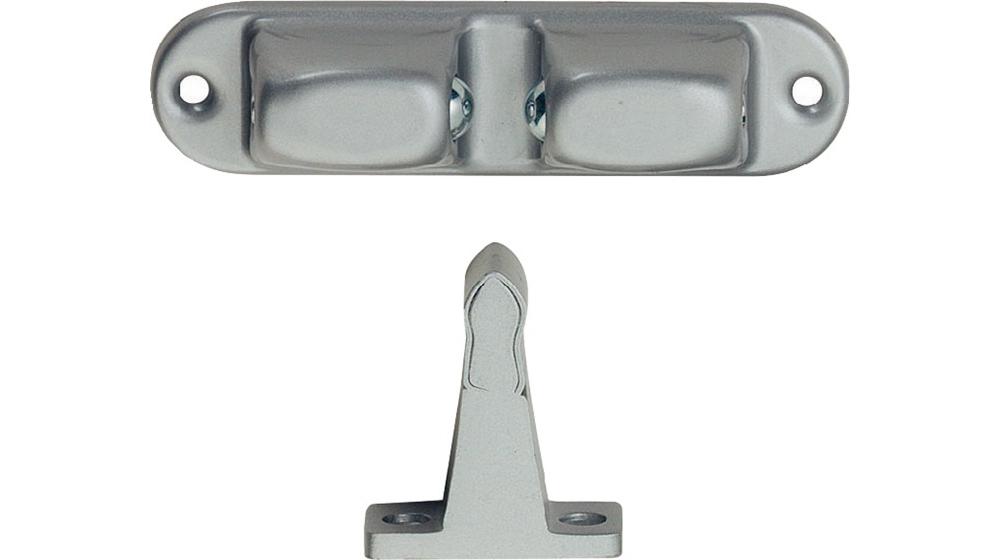 Montage: Der Feststeller wird bei größtmöglichem Abstand zum Türband auf der Tür befestigt und an entsprechender Stelle der Kloben an die Wand geschraubt. Ein waagerechtes Befestigen des Feststellers an der Tür behält auch bei sich nachträglich leicht hebender oder senkender Tür die volle Funktionsfähigkeit. Durch Stellschrauben kann der Kugeldruck reguliert werden.