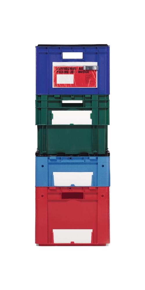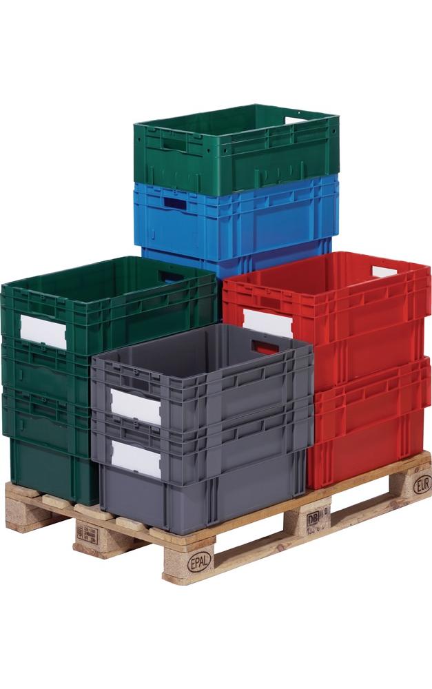 aus Polypropylen · verstärkter Rippenboden für eine hohe Traglast · Stapelbelastbarkeit ca. 500 kg · für Rollenbahnen geeignet · mit Durchfassgriff an der Stirnseite · mit Halterung für Belege · Sicherung des Deckels durch Plomben möglich (Zubehör) · lebensmittelecht · temperaturbeständig von -20 bis +90 °C · beständig gegen Öle, Fette und die meisten Säuren und Laugen · Seitenwände und Boden geschlossen, ineinander und aufeinander stapelbarWeitere technische Eigenschaften: