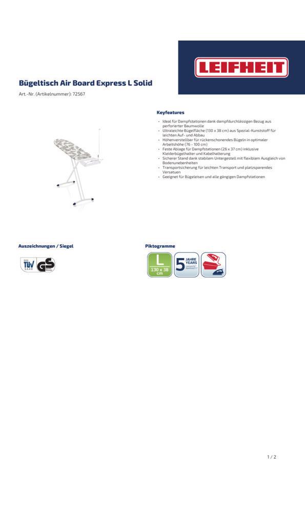 Ultraleicht und stabil, mit extragroßer Bügelfläche und perfekt für den Einsatz einer Dampfstation geeignet. Der Leifheit Air Board Express L Solid bietet alles, was ein moderner Bügeltisch braucht. Er ist leichter als jeder Streckmetallbügeltisch, dabei absolut stabil und standsicher und er besitzt eine extragroße Bügelfläche mit einem Bezug aus reiner, perforierter Baumwolle. Die lässt den Dampf des Bügeleisens hindurch und gewährleistet zugleich eine optimale Feuchtigkeitsaufnahme. Damit auch das Aufstellen und Wegräumen kinderleicht von der Hand gehen, ist der Air Board Express L Solid mit einer Bügelfläche ausgestattet, die aus einem ultraleichten Spezialkunststoff besteht. Die 130 x 38 cm große Bügelfläche ruht auf einem 35 mm starken, absolut standsicheren Rundrohr-Untergestell. Es lässt sich bis zu einer Höhe von 100 cm und damit auf jede Körpergröße und Arbeitshöhe einstellen. Ausgestattet ist der Bügeltisch mit einer festen Dampfstationsablage aus Metall, die zu allen gängigen Dampfstationstypen passt und zum Abstellen konventioneller Bügeleisen eine sichere Mulde bietet. Der Kleiderbügelhalter an der Ablage ermöglicht das Aufhängen von Hemden oder Jacken nach dem Bügeln. Inklusive Kabelhalterung für ein Bügeln ohne störendes Stromkabel.Attribute