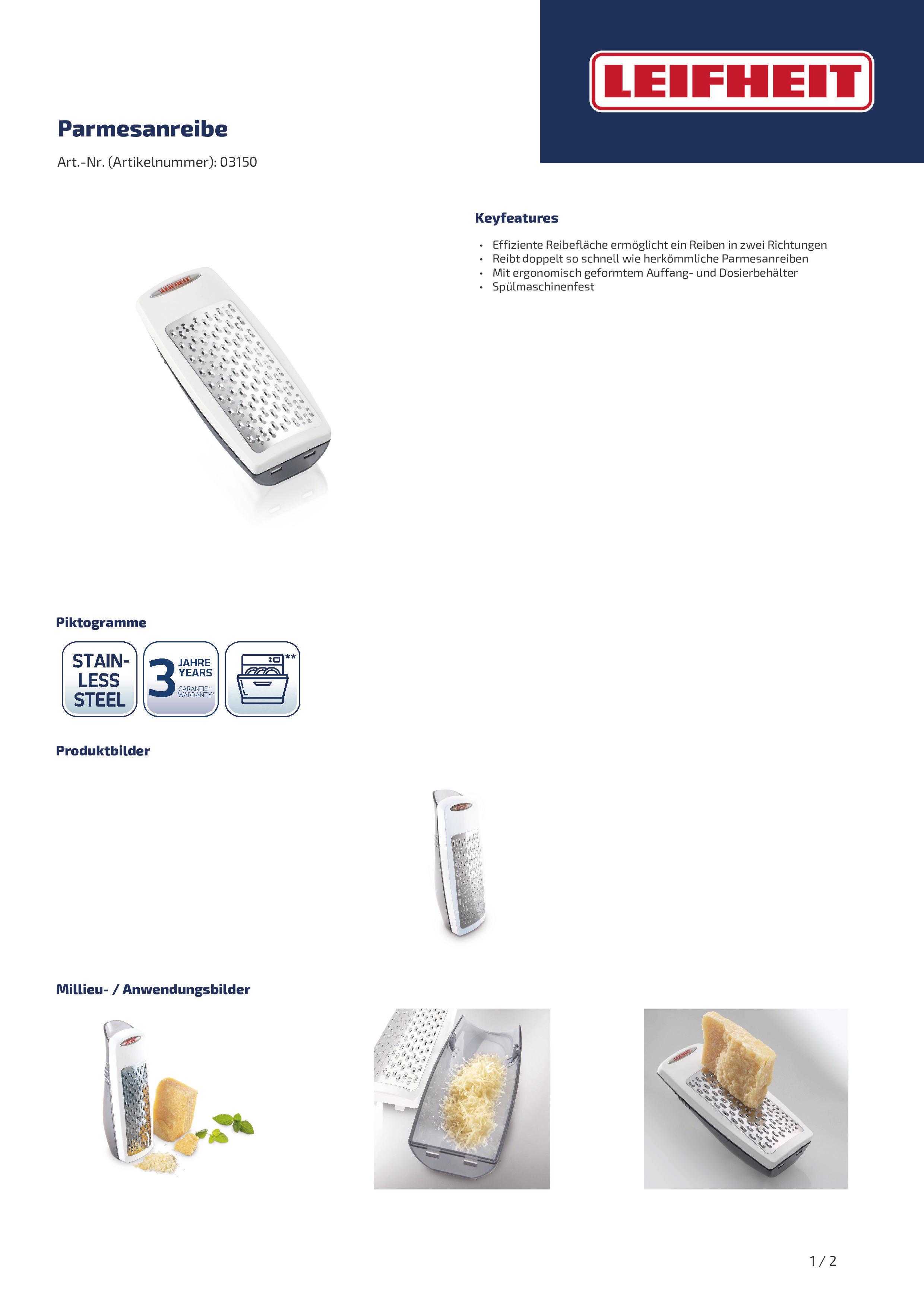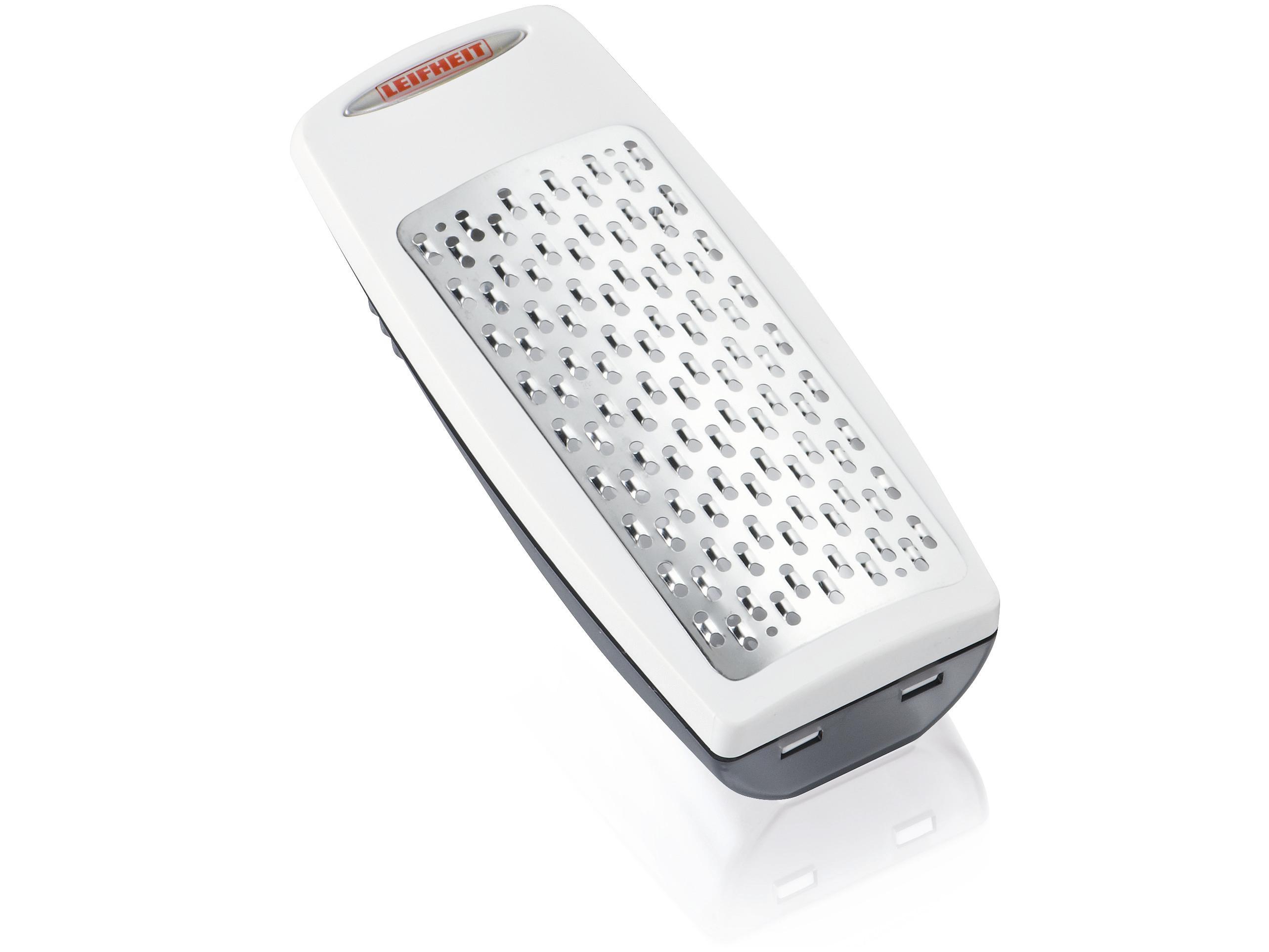 Herkömmliche Reiben reiben nur in eine Richtung, was den doppelten Reibeaufwand bedeutet. Die Leifheit Parmesanreibe besitzt eine besondere Reibefläche, die ein Reiben in zwei Richtungen ermöglicht: So lässt sich der Parmesan mühelos und doppelt so schnell reiben. Nach dem Reiben fällt der Käse in einen integrierten Behälter, der durch seine Ausschüttform ein exaktes Dosieren ermöglicht. Besonders praktisch und dekorativ ist auch das Design: Es liegt gut in der Hand und ermöglicht die Aufbewahrung sowohl liegend als auch stehend. Der Auffangbehälter eignet sich auch zum Aufbewahren des Käses. Spülmaschinenfest.Attribute