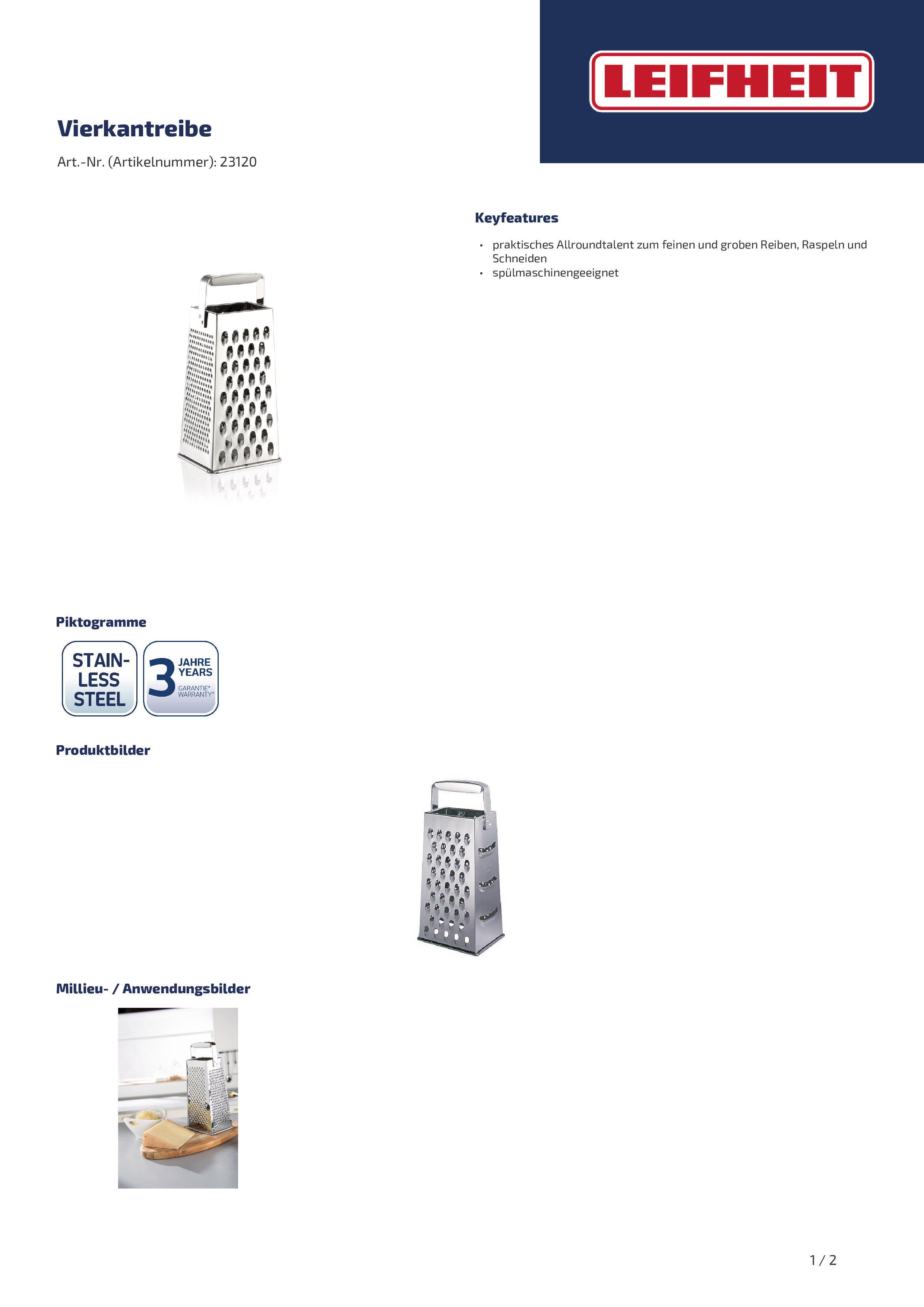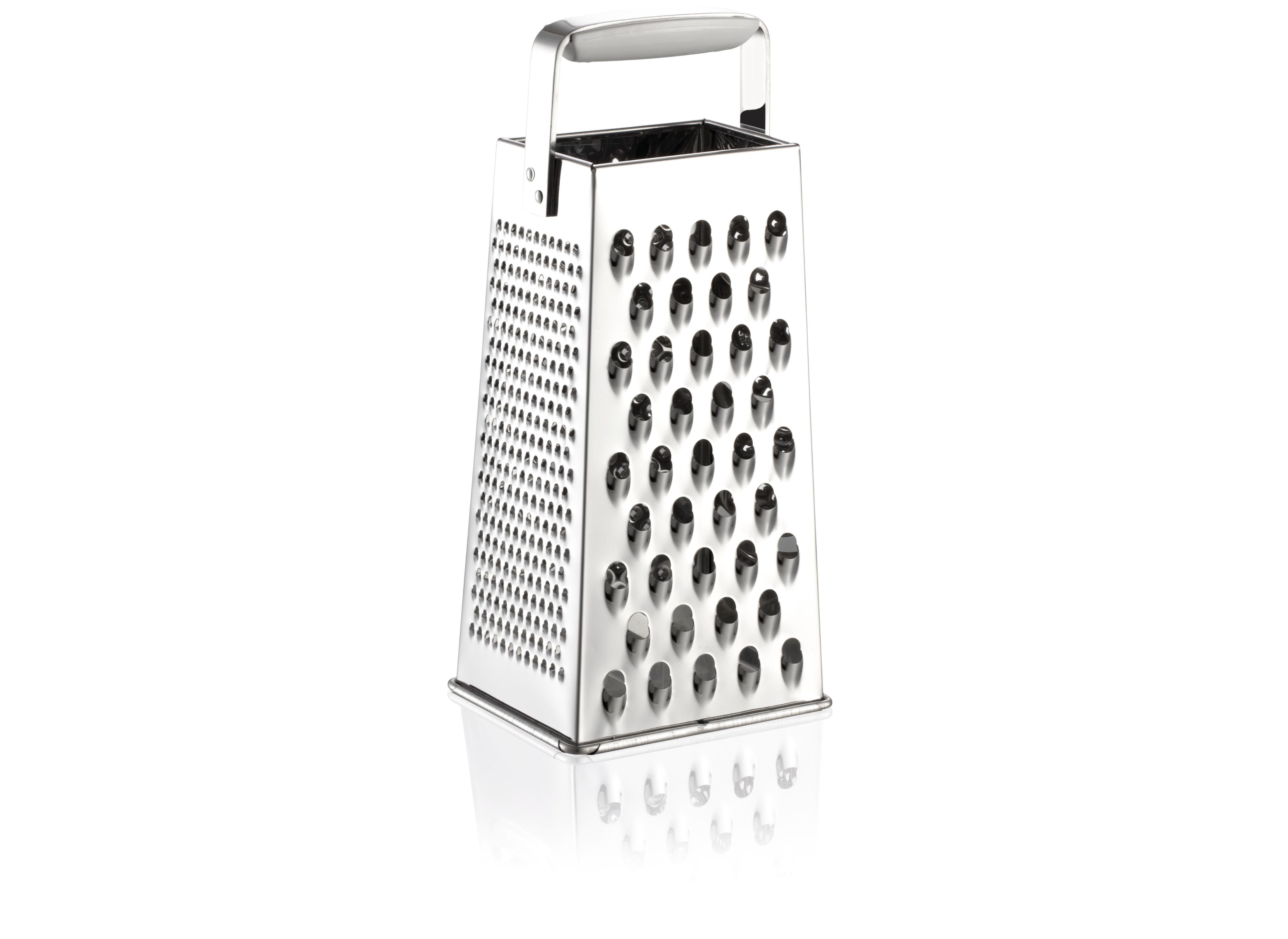 Ob grob oder fein geraspelt, ob in gleichmäßige Scheiben geschnitten oder fein gerieben. 4 Reibflächen zerkleinern mühelos Gurken, Kartoffeln, Käse und jede Art von Gemüse. Die ideale Allround-Reibe für einen abwechslungsreich angerichteten Rohkostteller. Ein Griff mit Kunststoff-Einsatz sorgt für ein angenehmes Festhalten. Zum Reinigen wird sie einfach in die Spülmaschine gesteckt.Attribute
