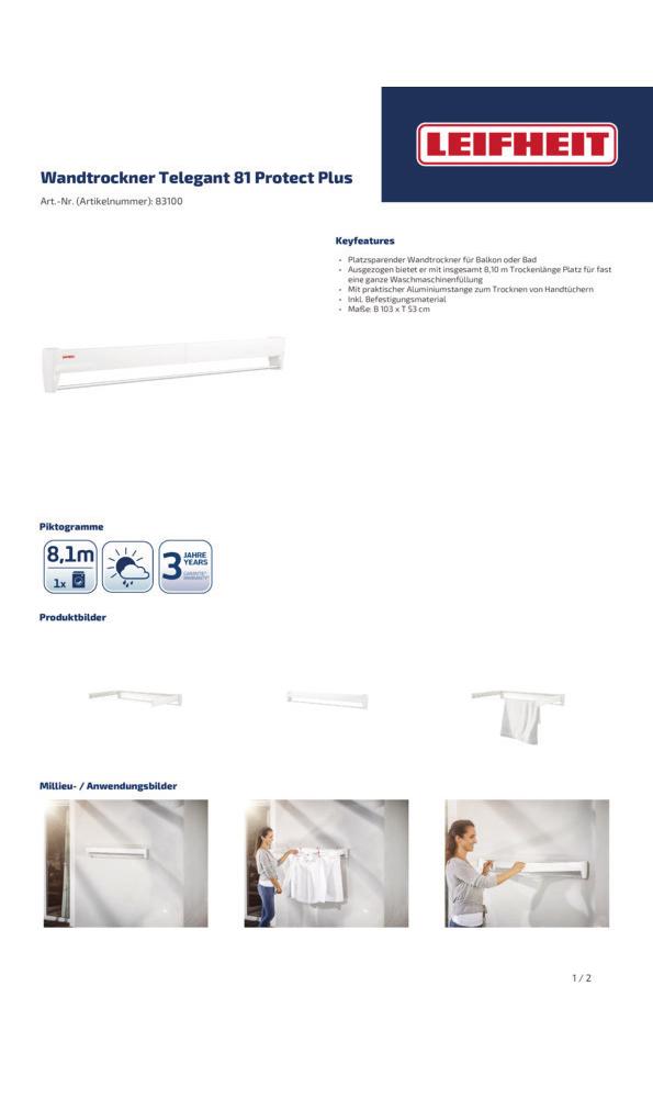 Der unverzichtbare Trockenplatz fürs Bad: geschlossen ist der Telegant 81 Protect Plus von Leifheit ein formschöner und eleganter Handtuchhalter mit einer verchromten Handtuchstange. Geöffnet bietet er acht Trockenstäbe à 90 cm und damit Platz für fast eine ganze Waschmaschinenfüllung. Nach der einfachen Montage überzeugt er mit seiner hohen Tragfähigkeit und den dauerhaft rostgeschützten Trockenstäben.Attribute