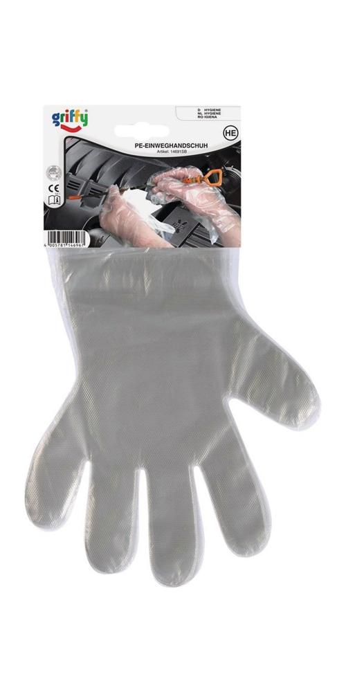 Kat. I · Material: Polyethylen · Folie mit Schweißnaht · gehämmert · nahtlos · beidseitig tragbar · in praktischer SB-Aufmachung · auf PappetikettSB à 20 St. · Anwendung: für Arbeiten in der Reinigungsbranche, Tankhandschuhe, Küchen- und Kantinenbereich, Bäckereien, KFZ- und Malerbereich, Friseurgeschäfte
