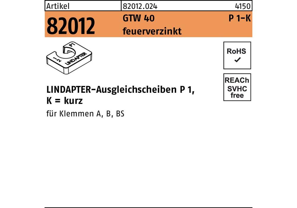 Artikel 82012 GTW 40 P 1-K feuerverzinkt LINDAPTER-Ausgleichsscheiben P 1 · kurz - Abmessung: M 24 / 12,0 VE=S (1 Stück )Weitere technische Eigenschaften: