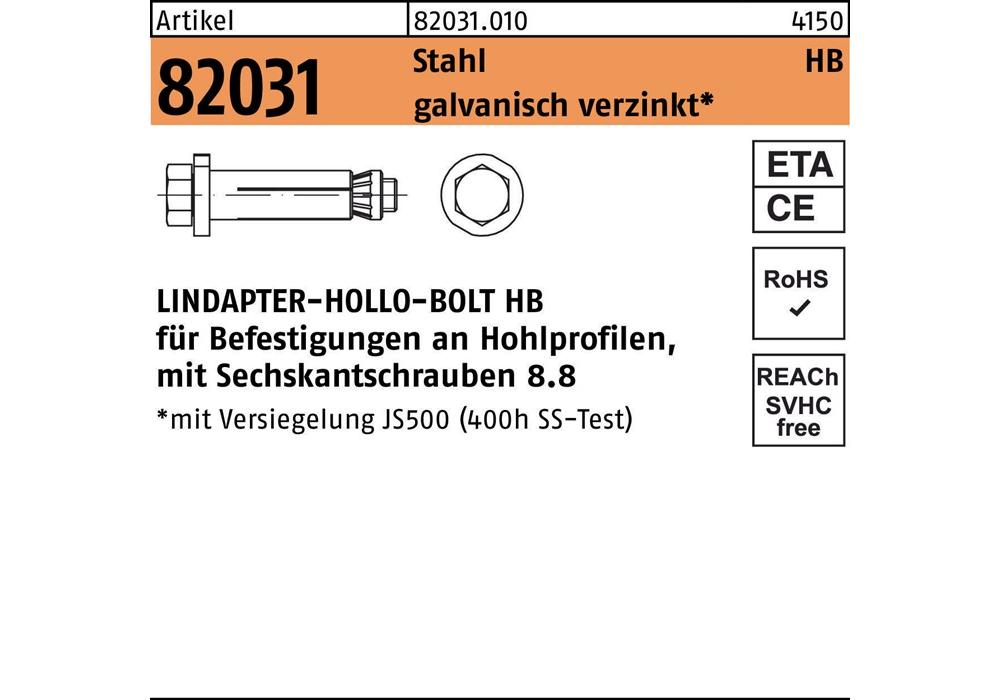 Artikel 82031 Stahl HB galvanisch verzinkt LINDAPTER-HOLLO-BOLT HB f. Befestigungen an Hohlprofilen · mit Sechskantschraube - Abmessung: HB 12-1 ( 60/25) VE=S (1 Stück)Weitere technische Eigenschaften:
