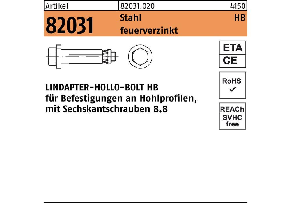 Artikel 82031 Stahl HB feuerverzinkt LINDAPTER-HOLLO-BOLT HB f. Befestigungen an Hohlprofilen · mit Sechskantschraube - Abmessung: HB 20-3 (150/86) VE=S (1 Stück)Weitere technische Eigenschaften: