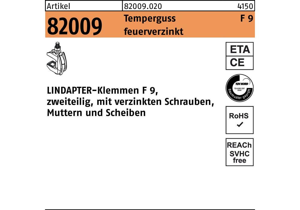 Artikel 82009 Temperguss F 9 feuerverzinkt LINDAPTER-Klemmen F 9 · zweiteilig · mit verzinkten Schrauben · Muttern u. Scheibe - Abmessung: M 24 / 45 - 95 VE=S (1 Stück )Weitere technische Eigenschaften: