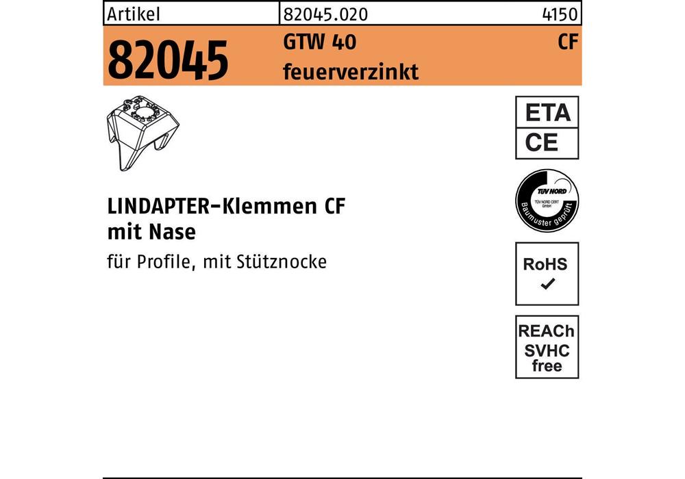 Artikel 82045 GTW 40 CF feuerverzinkt LINDAPTER-Klemmen CF mit Nase - Abmessung: M 16 VE=S (1 Stück )Weitere technische Eigenschaften: