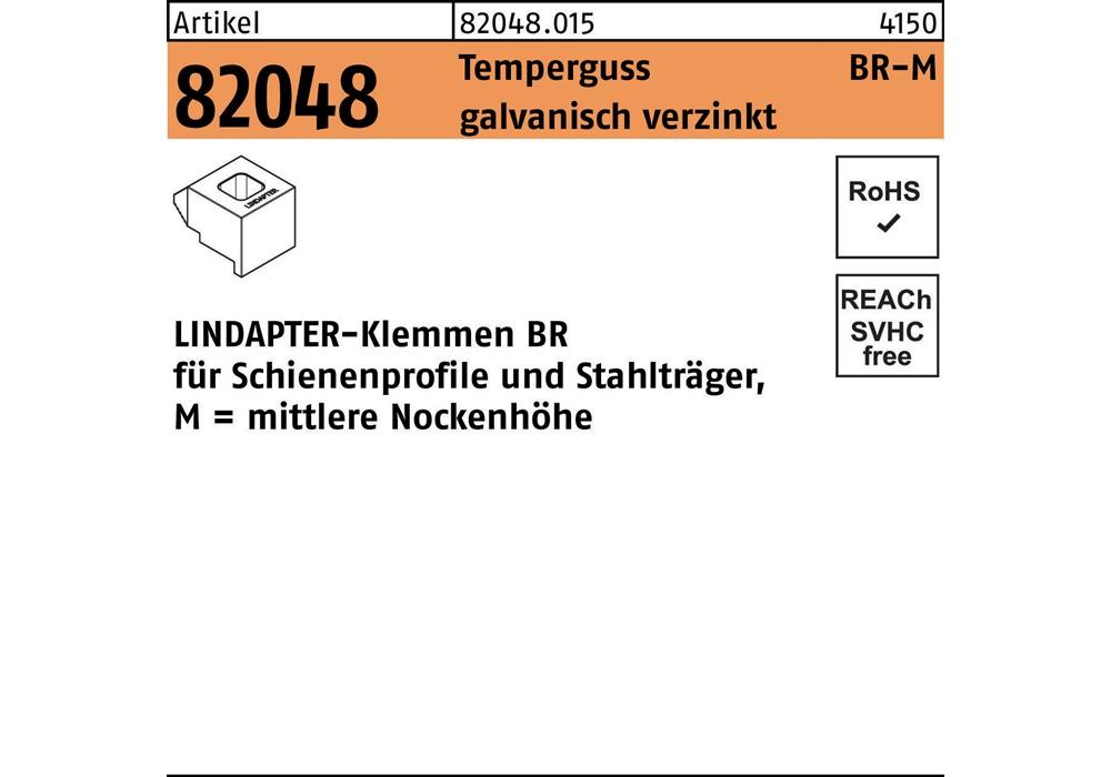Artikel 82048 Temperguss BR-M galvanisch verzinkt LINDAPTER-Klemmen BR für Schienenprofile und Stahlträger · mittlere Nockenhöh - Abmessung: BR 16 / 8,0 VE=S (1 Stück )Weitere technische Eigenschaften: