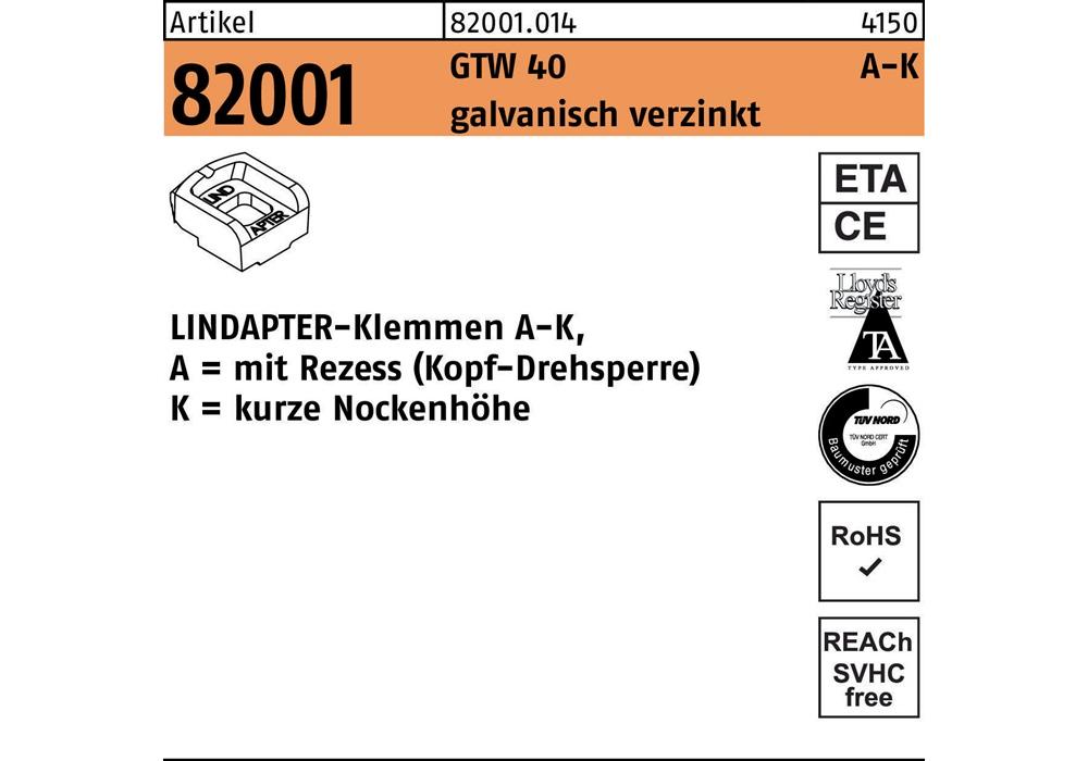 Artikel 82001 GTW 40 A-K galvanisch verzinkt LINDAPTER-Klemmen A-K mit Rezess (Kopf-Drehsperre) · kurze Nockenhöhe - Abmessung: KM 10 / 4,0** VE=S (1 Stück )Weitere technische Eigenschaften: