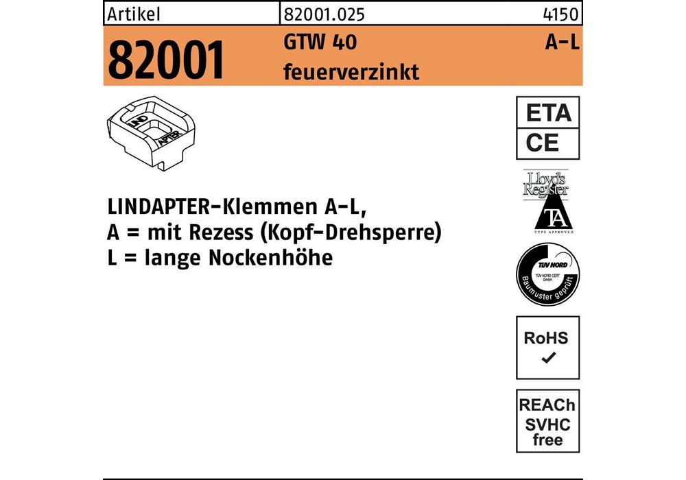 Artikel 82001 GTW 40 A-L feuerverzinkt LINDAPTER-Klemmen A-L mit Rezess (Kopf-Drehsperre) · lange Nockenhöhe - Abmessung: LM 24 / 16,0 VE=S (1 Stück )Weitere technische Eigenschaften: