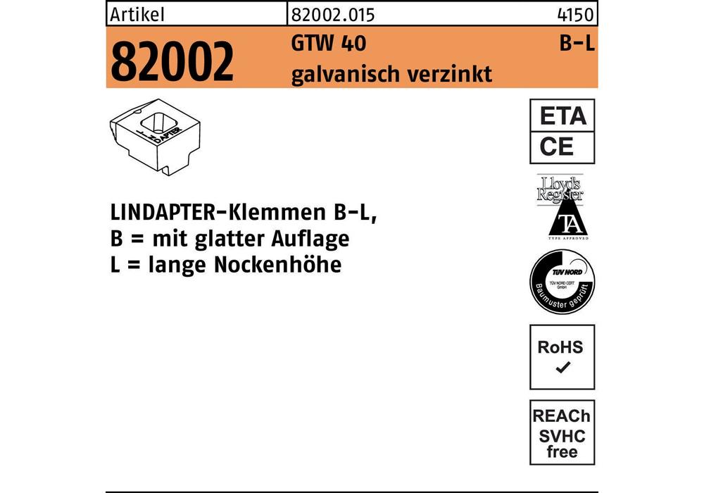 Artikel 82002 GTW 40 B-L galvanisch verzinkt LINDAPTER-Klemmen B-L mit glatter Auflage · lange Nockenhöhe - Abmessung: LM 12 / 9,5 VE=S (1 Stück )Weitere technische Eigenschaften: