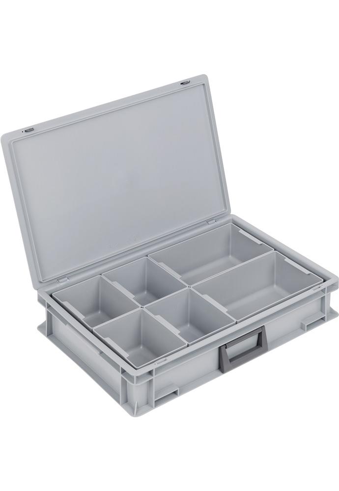 aus Polypropylen · mit 6 Einsatzkästen · mit 1 Griff an der Längsseite · Einsatzkästen grau, 2 St., L 274 x B 174 x H 110 mm, 4 St. L 137 x B 174 x H 110 mm · mit einrastendem Schiebeverschluss · sehr stabil · rutschsicher stapelbar · resistent gegen die meisten Säuren und Öle · temperaturbeständig von -20 °C bis +80 °C · Farbe grauWeitere technische Eigenschaften: