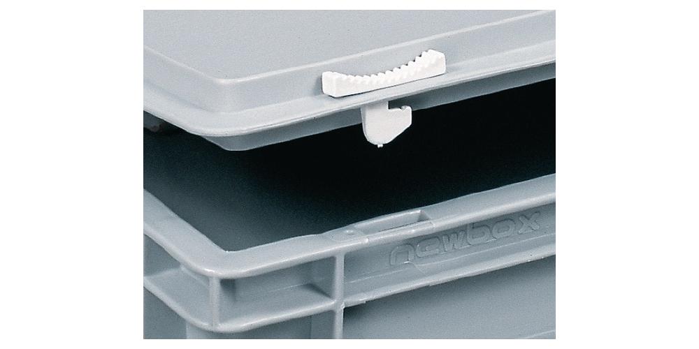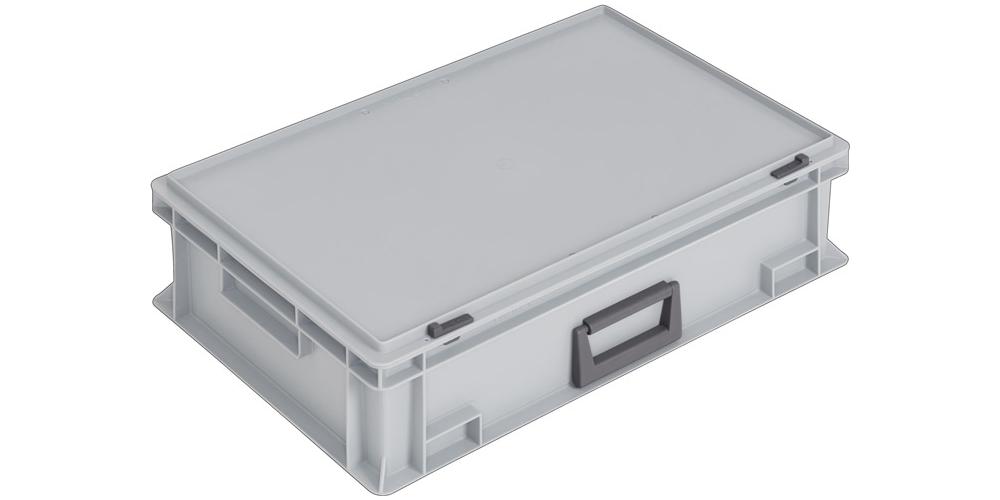 aus Polypropylen · mit 1 Griff an der Längsseite · mit einrastendem Schiebeverschluss · sehr stabil · rutschsicher stapelbar · resistent gegen die meisten Säuren und Öle · temperaturbeständig von -20 °C bis +80 °C · Farbe grau