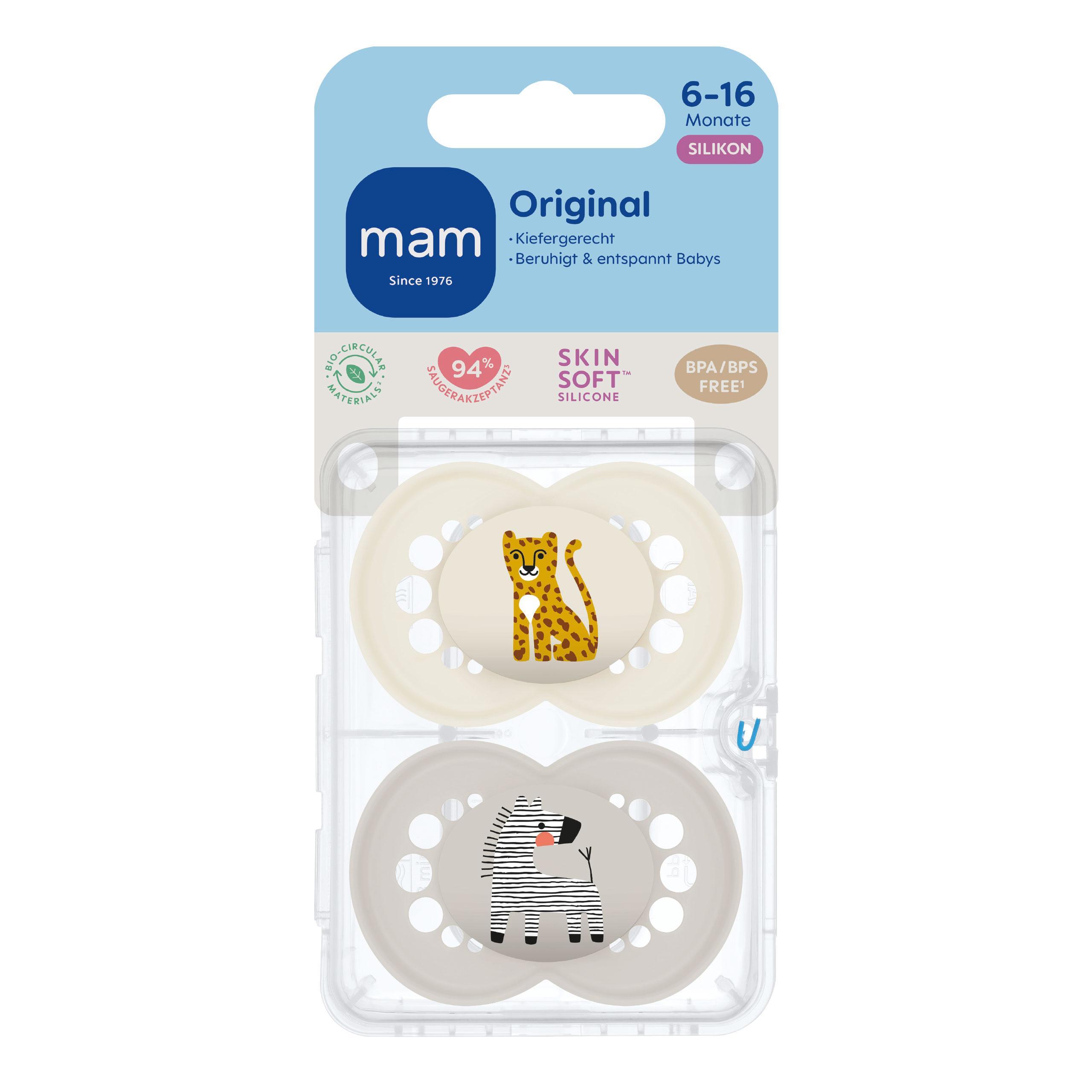 MAM Original 6-16 Silikon Schnuller im 2er-Set – mit kiefergerechtem Saugteil, Leopard/Zebra Der Sauger besteht aus speziellem SkinSoft Silikon, das sich besonders weich und vertraut anfühlt und so von 94 % der Kinder instinktiv akzeptiert wird.¹ MAM Schnuller werden gemeinsam mit Zahnmediziner*innen entwickelt und sind dank ihres symmetrischen, flachen Saugteils besonders zahn- und kieferfreundlich. Zusammen mit dem symmetrisch geformten Schnullerschild liegt der Schnuller immer richtig herum in Babys Mund. Das Schild ist besonders sanft zu Babys empfindlicher Haut dank großzügiger Luftlöcher, der abgerundeten Form und der Noppen auf der Innenseite. Der Schnullerknopf ist für kleine Babyhände einfach zu greifen, aber gleichzeitig so flach, dass der Schnuller für Babys in jeder Lage bequem ist. Wir übernehmen Verantwortung für dein Baby und unseren Planeten. Schnullerschild, -knopf & Sterilisierbox sind aus Polypropylen, das gemäß dem von ISCC PLUS zertifizierten Massenbilanzverfahren rückführbar auf bio-zirkuläre Rohstoffe ist. Die Schnuller werden in einer praktischen Sterilisier- und Transportbox geliefert. In der Box kann der Babyschnuller einfach und schnell, ohne separates Gerät in der Mikrowelle sterilisiert werden. So können Eltern bis zu 77 % Energie und CO₂ einsparen.² Schnuller entspricht EN 1400 BPA/BPS-frei Die Produktvorteile im Überblick: MAM Original Schnuller 2er-Set Für Babys & Kleinkinder (6-16 Mon) Mit Kieferorthopäd*innen & Zahnmediziner*innen entwickelt Instinktiv akzeptiert Besonders haut- & kieferfreundlich Sterilisier-/Hygienebox Quellen: ¹ Studie 2010–2023, n=1588 ² denkstatt, AT 2017MAM Original / MAM Air / MAM Perfect / MAM Supreme / MAM Comfort Schnuller Für die Sicherheit Ihres Kindes VORSICHT! Kontrollieren Sie den Schnuller vor jedem Gebrauch. Ziehen Sie den Schnuller in alle Richtungen. Werfen Sie ihn beim ersten Anzeichen von Beschädigungen oder Mängeln sofort weg. Verwenden Sie nur spezielle Schnullerbänder, die der EN 12586 entsprechen. Befestigen Sie niemals andere Bänder oder Schnüre an einem Schnuller, Ihr Kind kann sich mit ihnen strangulieren. Setzen Sie den Schnuller nicht direktem Sonnenlicht oder Hitze aus und legen sie ihn nie länger in Desinfektionslösungen als empfohlen, da dadurch das Saugteil beeinträchtigt werden kann.
