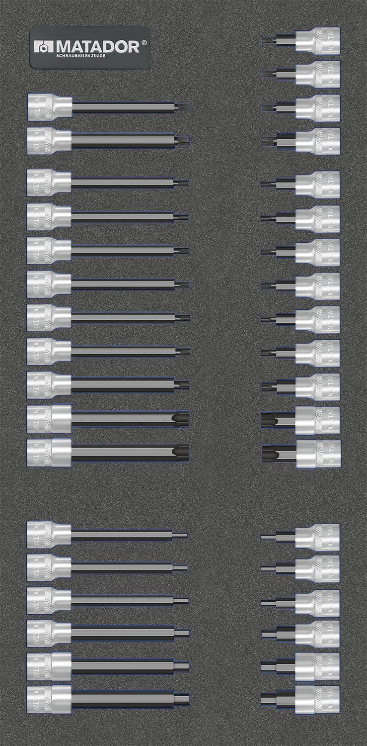 Das MATADOR MTS-Modul mit dem 36-tlg. 10 mm (3/8") Steckschlüssel-Satz ist eine sinnvolle Ergänzung für jede Werkstatt. Besonders im KFZ-Bereich ist diese Antriebsgrösse beliebt und aufgrund der Zusammenstellung ist dieser Satz eine sinnvolle Ergänzung zu bereits bestehenden Steckschlüsselsortimenten. Die zweifarbige Weichschaumeinlage ermöglicht die perfekte Ordnung und die leichte Werkzeugkontrolle (fehlendes Werkzeug wird sofort erkannt) und ist vollkommen flexibel kombinierbar. Passend für die MATADOR-Werkstattwagen RATIO und VARIO sowie die Men's Kitchen, aber auch für die meisten handelsüblichen Werkstattwagen und Schubladen. Enthält Sechskant-Steckschlüssel-Einsätze: 5 - 6 - 7 - 8 - 10 mm, XZN-Steckschlüssel-Einsätze: M5 - M6 - M8 - M10, sowie M8 und M10 in langer Ausführung, TORX®-Steckschlüssel-Einsätze in kurzer und langer Ausführung: T15 - T20 - T25 - T27 - T30 - T40 - T45 - T50 - T55.