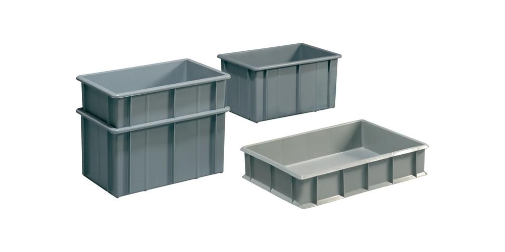 aus Polyethylen · hochbelastbar und ausgestattet mit extra-stabilisierenden Stapelrippen · glatte Innenflächen, leicht zu reinigen · lebensmittelecht · temperaturbeständig von -20 °C bis +90 °C · Farbe grauWeitere technische Eigenschaften: