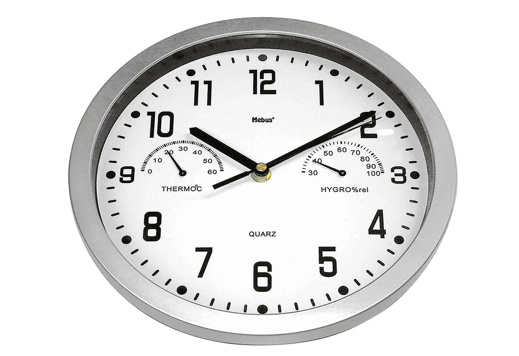 Mebus Quarz-Wanduhr analog mit Thermometer / Hygrometer ohne 1x AA Batterie Ø22,5cm silber