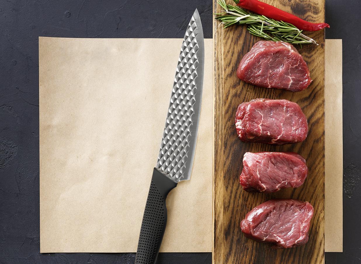 Messer-Set "Air Blade" 5-teilig. Die spezielle Rhombenstruktur auf der Spezialklinge machen die Harry Blackstone AirBlade Messer zu etwas ganz Besonderem. Sie werden dadurch ultra leicht, sehr stabil und scharf zugleich. Ebenso hat die Oberfläche durch die Struktur eine hervorragende Anti-Haft-Eigenschaft und nichts, dass Sie schneiden bleibt kleben oder haftet an der Klinge. Der ergonomisch geformte Griff liegt perfekt in der Hand, selbst bei Nässe sorgt er für besonders sicheres Schneiden. Dank der 5 verschiedenen Größen haben Sie für jede Gelegenheit das passende Messer bereit.Lieferumfang: