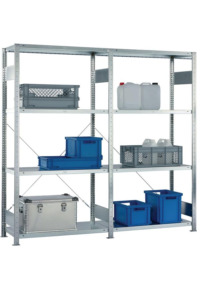 bestehend aus: 1 Grund- und 1 Anbauregal mit jeweils 4 Fachböden · verzinktWeitere technische Eigenschaften: