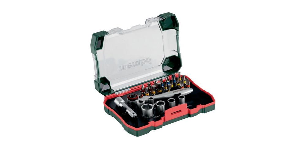 Bestehend aus: S 2-Bits L= 25 mm (18 St.): je 1 x PH 1. PH 2. PH 3 · PZ 1. PZ 2. PZ 3 · H 3. H 4. H 5. H 6 · T 10. T 15. T 20. T 25. T 30 · SL 4. SL 5.5. SL 6.5 Steckschlüssel (6 St.): je 1 x 1/4″ · 6 mm · 7 mm · 8 mm · 10 mm · 13 mm 1 x Verlängerung · 1 x Ratsche Bits aus Chrom-Vanadium-Stahl (S2-Qualität) · Bits mit Farbcodierung: für ein schnelles und einfaches Auffinden des passenden Bits · Hochwertige Ratsche · Steckschlüssel aus Chrom-Vanadium-Stahl · Hochwertige · robuste Box im speziellen Metabo-Design · Euroloch-AufhängerLieferumfang: S 2-Bits L= 25 mm (18 St.): je 1 x PH 1. PH 2. PH 3, PZ 1. PZ 2. PZ 3, H 3. H 4. H 5. H 6, T 10. T 15. T 20. T 25. T 30, SL 4. SL 5.5. SL 6.5 Steckschlüssel (6 St.): je 1 x 1/4", 6 mm, 7 mm, 8 mm, 10 mm, 13 mm 1 x Verlängerung, 1 x Ratsche
