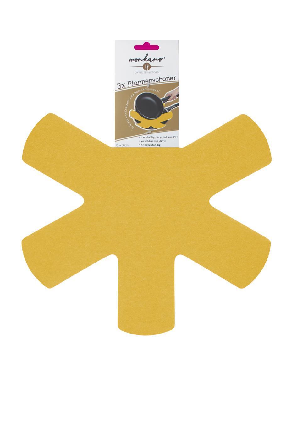 3-teiliges Pfannenschonerset in gelb, Durchmesser 38 cm, aus recycletem PE-Material, waschbar bei 40°C, hitzebeständig bis 200°C, Rückseite Anti-Rutsch, auch als Untersetzer verwendbarAttribute