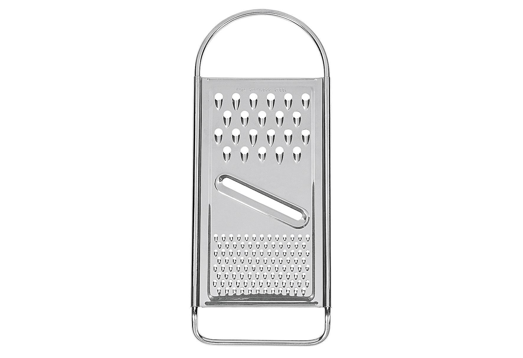 Die my basics Küchenreibe aus langlebigem Edelstahl hilft Ihnen, in der Küche Ihr Gemüse im Handumdrehen zu raspeln oder in Scheiben zu schneiden. Dank des runden Griffs liegt der Küchenhelfer gut in der Hand und kann nach Gebrauch auf eine Hakenleiste aufgehängt werden. Die Maße der Küchenreibe betragen 29,5 x 11,5 x 1,5 cm.spülmaschinengeeignet