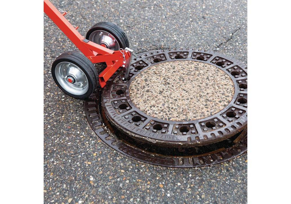 zum Anheben von Kanaldeckeln · einfache Anpassung an die Körpergröße durch die Teleskopführungsstange · Farbe: rot pulverbeschichtet · Gewicht 9 kg · Vollgummi-Schwerlasträder · Einsatzbereich: Schachtdeckel bis 150 kg (freisitzende Deckel)Weitere technische Eigenschaften: