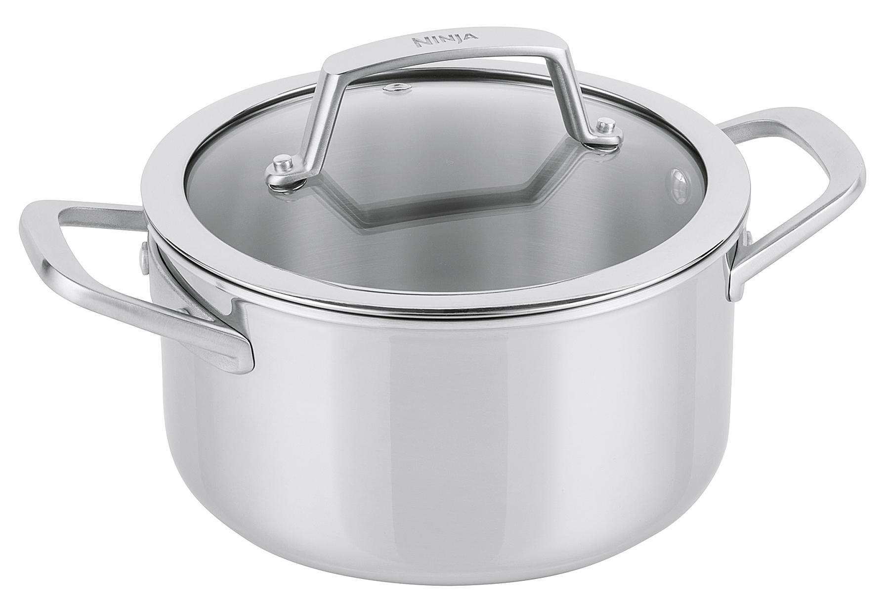 NINJA Bratentopf "EverClad" Ø 18 cm, H 15,2 cm, aus Edelstahl mit Glasdeckel. Fassungsvermögen 2,3 l. Für alle Herdarten geeignet, kompatibel mit Ø 15 cm Induktionsring. Ofenfest bis 315 °C, spülmaschinengeeignet.Lieferumfang: