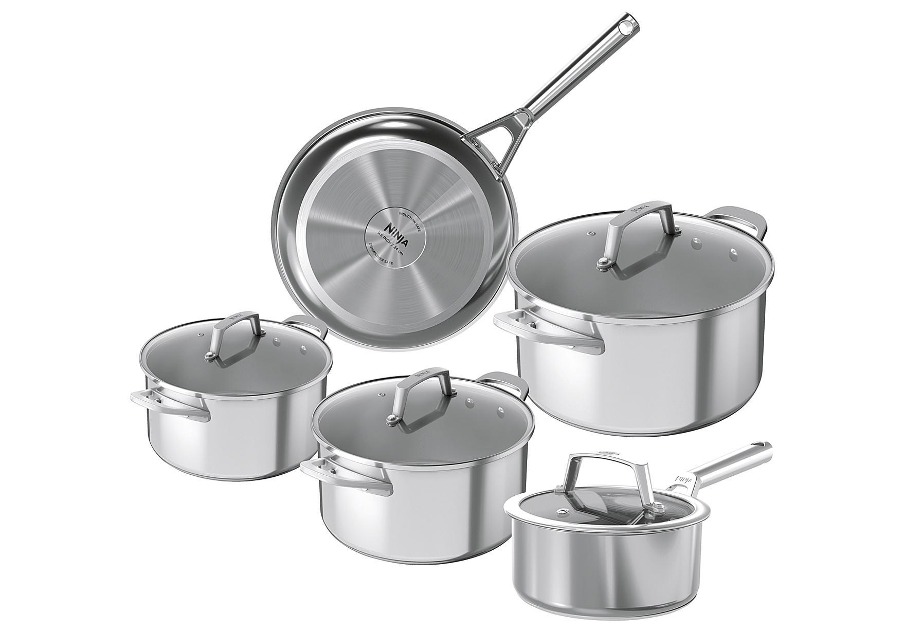 NINJA Topf- und Pfannen-Set "Zerostick" 5-teilig aus Edelstahl. Inhalt: je 1 x Pfanne Ø 16cm und Ø 24 cm und je 1 x Kochtopf Ø 16 cm, Ø 18 cm und Ø 20 cm.Lieferumfang: