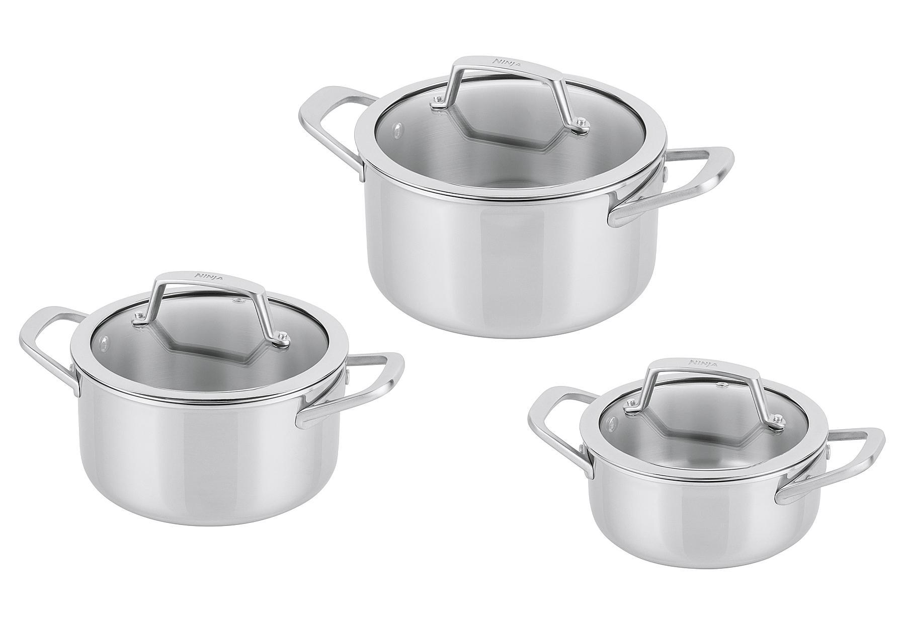 NINJA Topfset "EverClad" 3-teilig aus Edelstahl mit Glasdeckel. Inhalt: jeweils 1 x Topf 1,4 l, Ø 16 cm, H 12,5 cm / 2,3 l, Ø 18 cm, H 15,2 cm / 3,3 l, Ø 20 cm, H 16,5 cm. Für alle Herdarten geeignet, kompatibel mit Ø 13 cm, 15 cm, 17 cm Induktionsring. Ofenfest bis 315 °C, spülmaschinengeeignet.