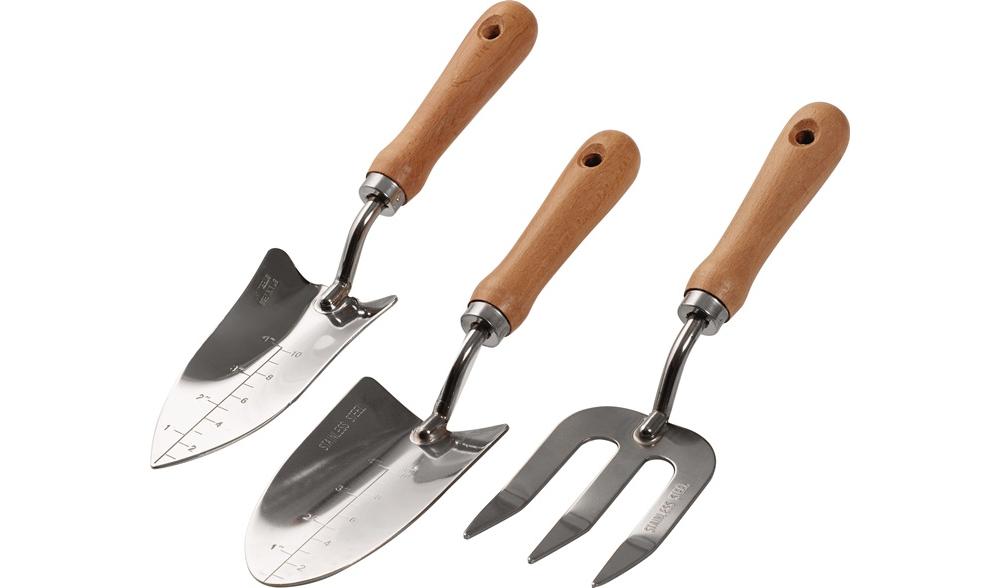 ideal für die Bepflanzung oder Umpflanzung im Garten oder auf dem Balkon · Set besteht aus einer Pflanzkelle, einer Kelle und einer Pflanzgabel · hergestellt aus rostfreiem Stahl mit HolzgriffenAttribute