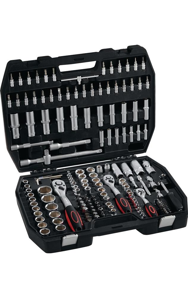 6,3 mm (1/4 ″), 10,0 mm (3/8 ″) und 12,5 mm (1/2 ″)-Vierkantantrieb · Steckschlüssel-Einsätze und Bedienelemente aus CV-Stahl · Inhalt: