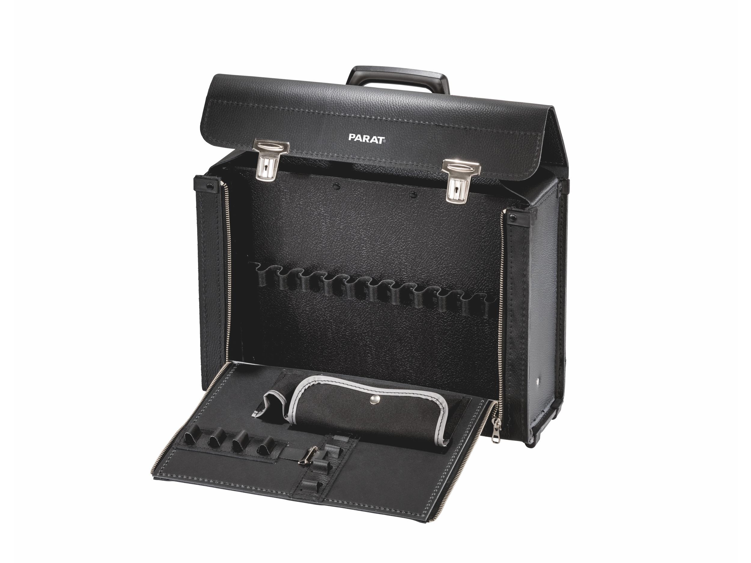 Die Werkzeugtasche NEW CLASSIC Plus von PARAT überzeugt durch hochwertige Materialien und ausgezeichnete Produktqualität. Sie besteht aus geprägtem Rindsleder, welches gegen Feuchtigkeit resistent, extrem robust und langlebig ist. Mit dem stabilen Tragegriff lässt sich die Werkzeugtasche optimal tragen. Integrierte Bodengleiter schützen sowohl die Tasche als auch den Arbeitsuntergrund vor Kratzern und Abnutzung. Die aufklappbare Vorderwand der Werkzeugtasche hält das benötigte Arbeitsmaterial schnell griffbereit und übersichtlich verstaut. Sie ist mit acht verstellbaren Schlaufen ausgestattet. Ein separates Einsteckfach nimmt Utensilien auf, die schnell zur Hand sein müssen. Darüber hinaus ist eine verschließbare Kleinteiletasche in die Vorderwand eingelassen. Die herausnehmbare Mittelwand ist mit elf Schlaufen und einem Klemmfach versehen. An der Rückwand der Werkzeugtasche befinden sich neun feste Schlaufen für weiteres Werkzeug. Der Boden ist innen mit verzinktem Stahlblech verstärkt, dies gibt der Werkzeugtasche zusätzliche Stabilität und schützt das Arbeitsmaterial. Die Werkzeugtasche kann durch praktische Steckschlösser verschlossen werden. Insgesamt fasst die NEW CLASSIC Plus rund 29 Werkzeuge in Schlaufen und Einsteckfächern, zusätzlich finden Hammer, Wasserwaage und sonstiges Equipment Platz auf dem Werkzeugtaschenboden.Attribute