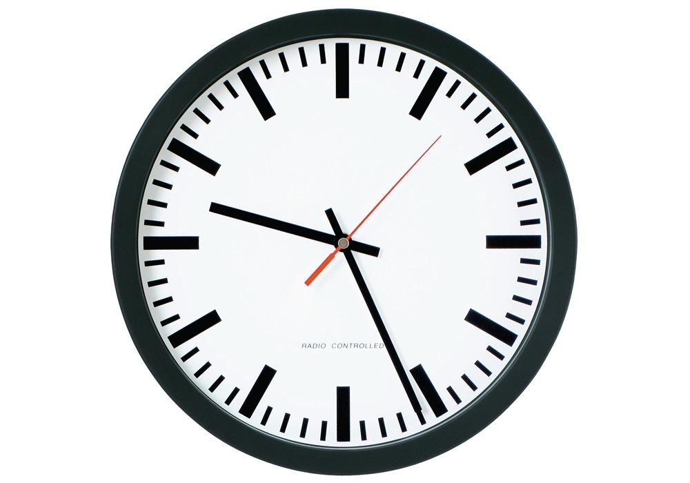 schwarzes Kunststoffgehäuse, typisches Bahnhofszifferblatt mit schwarzen Balkenstrichen · vollautomatische Sommer-/Winterzeitumstellung · Batteriebetrieb 1,5 V (Batterie nicht im Lieferumfang enthalten)Weitere technische Eigenschaften: