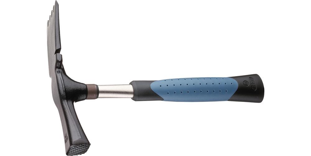 Kopf aus legiertem, gehärtetem Spezialstahl geschmiedet, fein geschliffen · gehärteter Schutzring aus Stahl für zusätzliche Sicherheit · Zahnschneide führt zu geringer Vibration beim Aufschlag · Stiel aus Chrom-Molybdän-Rohr · 2-Komponentengriff blau/schwarzWeitere technische Eigenschaften: