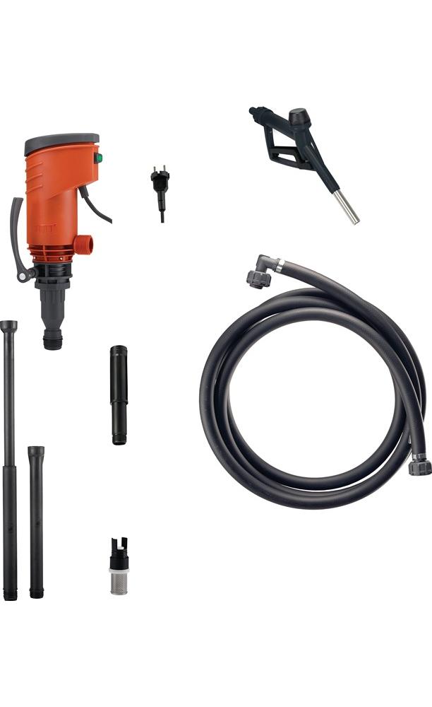 für Diesel und Heizöl · Hebelschutz nach WHG ständig wirksam · Fassgewinde G2a und M64x4a · Saugschlauch 1,6 m mit Filter · Abgabeschlauch 4 m mit Standard-Zapfventil (Kunststoff)Weitere technische Eigenschaften: