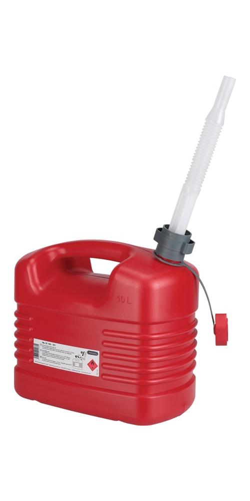 für flüssige Kraftstoffe, UN-Zulassung · mit flexiblem Auslauf · robust und unempfindlich gegen Schlageinwirkung · Verschlusskappe mit Fixierband gegen Verlust gesichert · Auslaufrohr mit integrierter Entlüftung · Auslaufrohr wird im Kanister aufbewahrt · Verschmutzungen durch Transport werden verhindert, ein Verlust des Auslaufrohres wird erschwert · hohe Standfestigkeit durch große Standfläche · durch massiven Handgriff einfach zu tragen · Griffmulde im Kanisterboden zur sicheren Verwendung · designoptimiert und formstabil durch umlaufende Behälterversteifungen · Material: HDPE · Ablaufrohrlänge 175 mm · Auslaufrohr Ø 20 mm