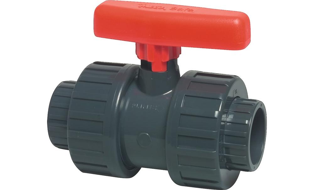 Kugelhahn aus PVC-U mit zwei Anschlüssen · Klebemuffen zur Verbindung · maximaler Druck: 16 bar · sichere gesperrte Kugel · Dichtung aus Hytrel/EPDM · alle Klebeverbindungen entsprechen EN-ISO 1452-3 · für Pumpen, Bewässerung und Futtersysteme in Industrie, Bewässerung und LandwirtschaftAttribute