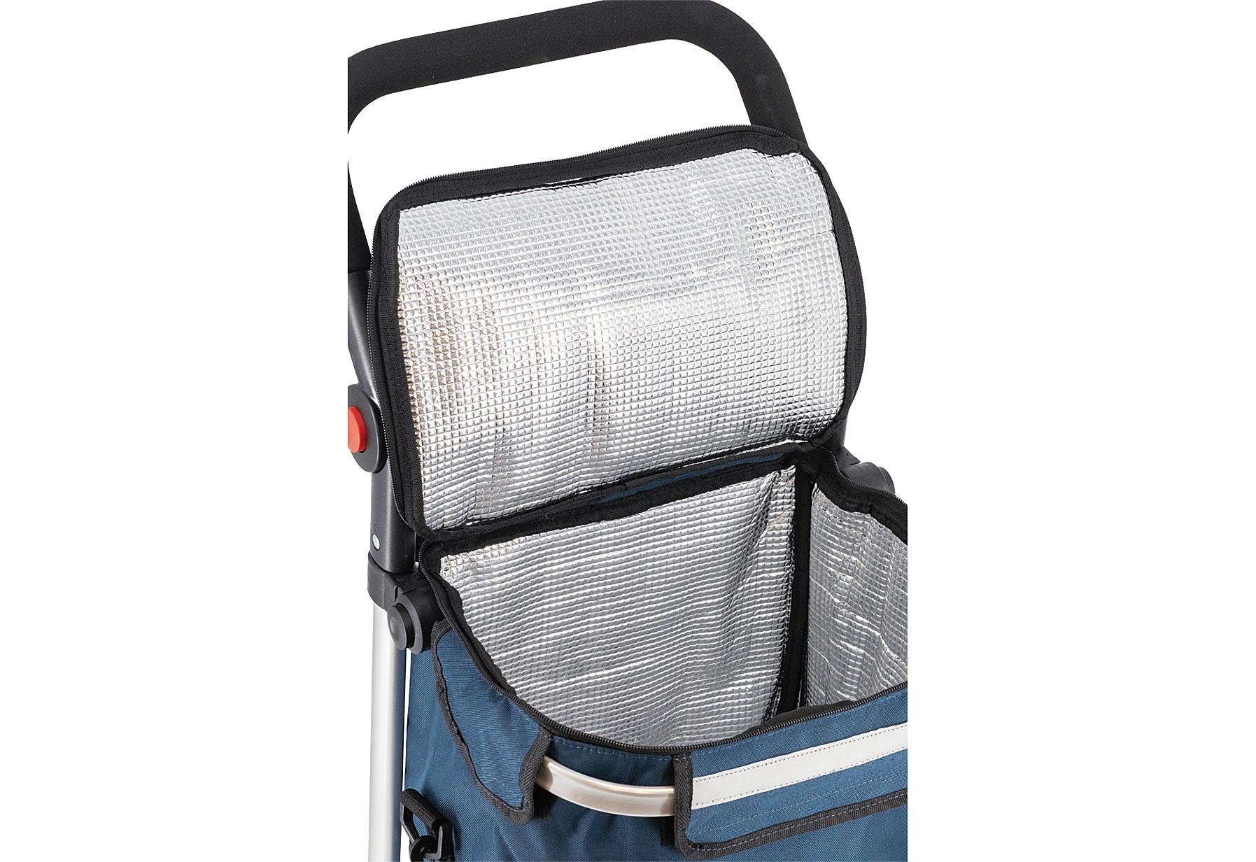 Trolley mit abnehmbare Einkaufstasche mit RV-Innentasche und langem Umhängeriemen mit Kühlfach. Große Öffnung durch praktischen umlaufenden Reißverschluss. Leichtes Aluminiumgestell mit stabiler Transport-Fläche zum Befördern von Getränkekisten. Max. Tragkraft 25 kg. Mit Haken zum Anhängen an den Einkaufswagen. Griff mit Soft-Touch-Verkleidung, große leichtlaufende Rollen.Eigenschaften: