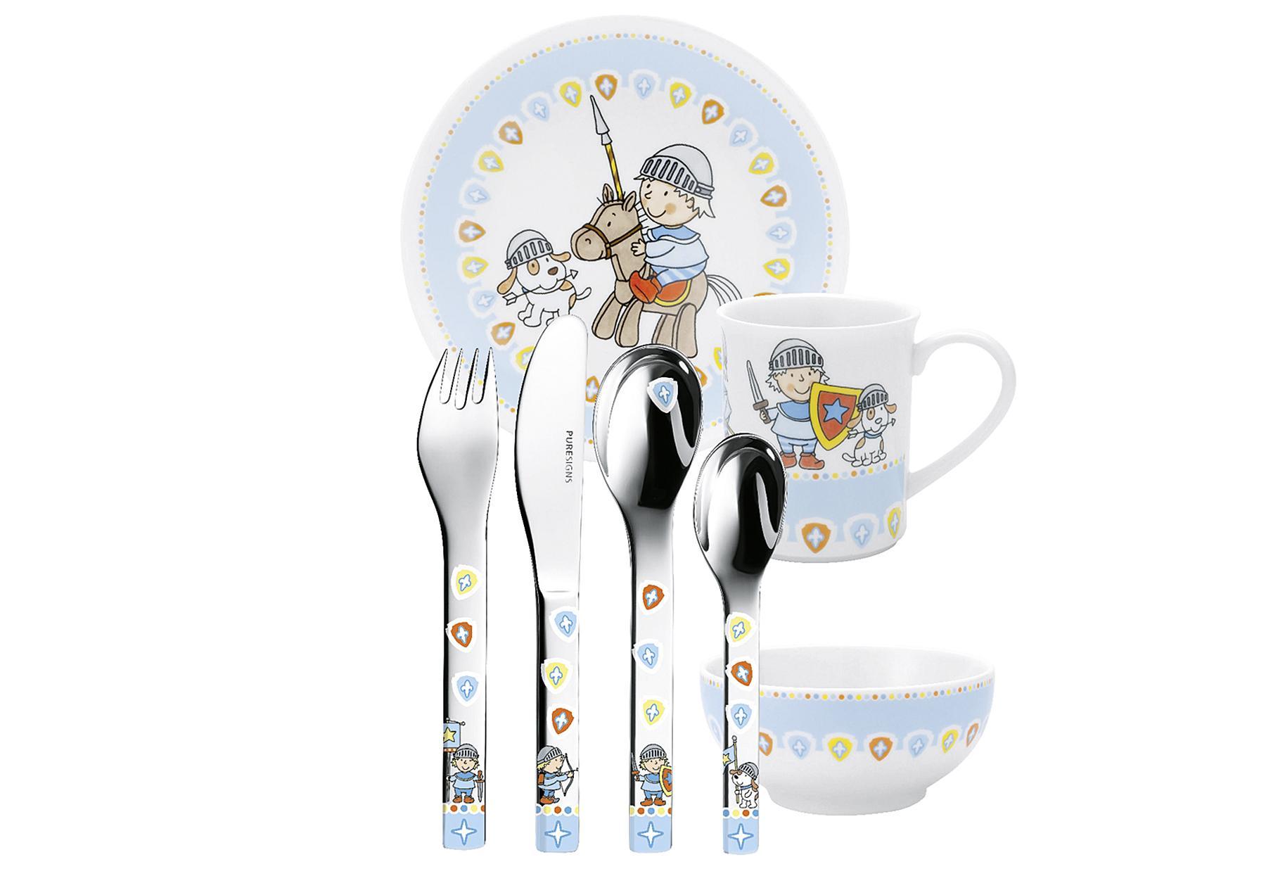 Kinderbesteck "Miko" 7-teilig. Motiv: Steinbeck. Welcher Junge träumt nicht davon einmal ein Held zu sein? Tapfer, mutig und mit großem Herzen zeigt der kleine Ritter mit seinen Gefährten allen Jungs, seine kleinen und großen Abenteuer. Inhalt: 1 Becher Ø 6,2 cm/ H 9 cm, 1 Müslischale Ø 14 cm, 1 Teller Ø 20,5 cm, Besteck-Set 4-teilig. Material: Porzellan / Edelstahl 18/10. Spülmaschinengeeignet.