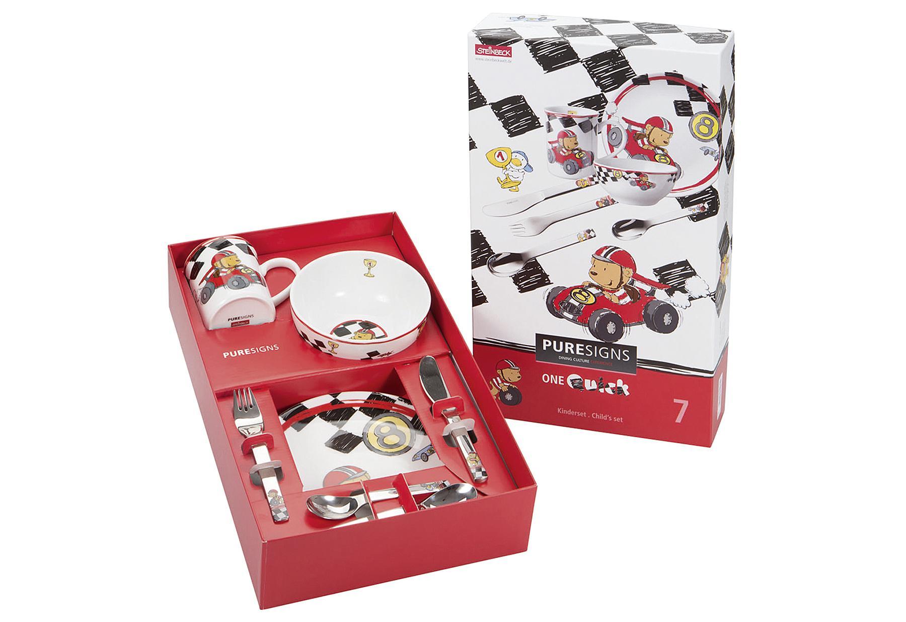 Kinderbesteck "Quick" 7-teilig. Motiv: Steinbeck. Auf die Plätze, fertig ..... und los geht’s. Die Faszination Auto und Geschwindigkeit, das Tüfteln und Schrauben begeistert alle Kinder. Mit dem kleinen bärenstarken Rennfahrer träumen sie sich in die Welt der rasanten Rennen und fahren ihrem großen Sieg entgegen. Inhalt: 1 Becher Ø 6,2 cm/ H 9 cm, 1 Müslischale Ø 14 cm, 1 Teller Ø 20,5 cm, Besteck-Set 4-teilig. Material: Porzellan / Edelstahl 18/10. Spülmaschinengeeignet.Attribute